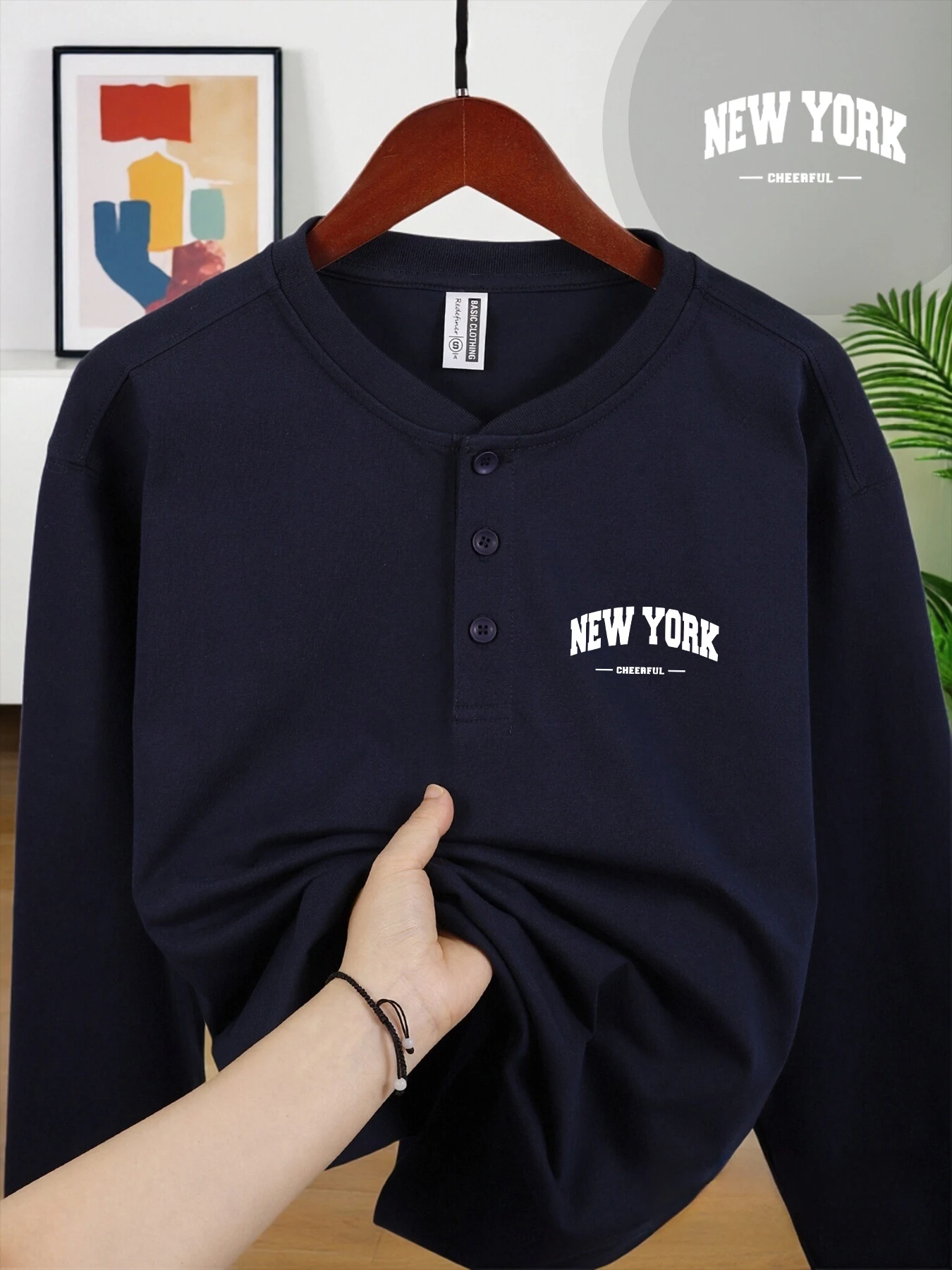 New York Cheerful Prints Mans Henry Shirt Skin-Friendly Autumn Tops Casual Clothes Crew Neck Business Comfortable Clothing