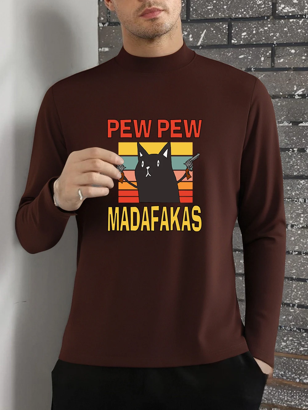 Pew Pew Madafakas Cats Prints T-Shirt Men'S Autumn Long Sleeves Bottoming Shirt Warm Half Turtleneck Slim Fit Tops Basic Clothes